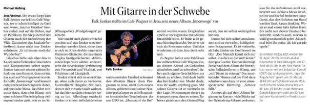 „Ähnlich wie zuletzt John Scofield ist auch für Zenker der Looper das wichtigste Zweitinstrument auf der Bühne, wobei er aber mit diesem Live-Sampler nicht nur zusätzliche Gitarrenstimmen kreiert, sondern auch perkussive Sounds und stark verfremdete, abstrakte und auch mal psychodelische Klangbausteine, die seine Gitarrenmusik ergänzen." [Jazzthetik 09/10 22, Lothar Trampert] SHOP_CD →