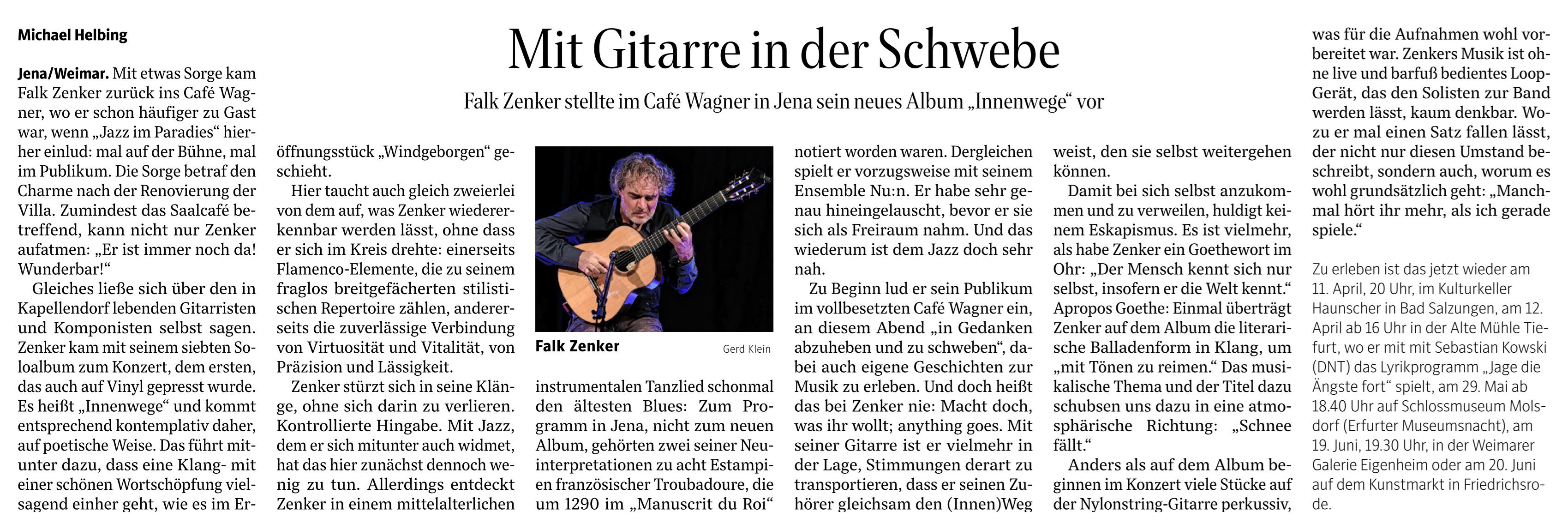 „Ähnlich wie zuletzt John Scofield ist auch für Zenker der Looper das wichtigste Zweitinstrument auf der Bühne, wobei er aber mit diesem Live-Sampler nicht nur zusätzliche Gitarrenstimmen kreiert, sondern auch perkussive Sounds und stark verfremdete, abstrakte und auch mal psychodelische Klangbausteine, die seine Gitarrenmusik ergänzen." [Jazzthetik 09/10 22, Lothar Trampert] SHOP_CD →